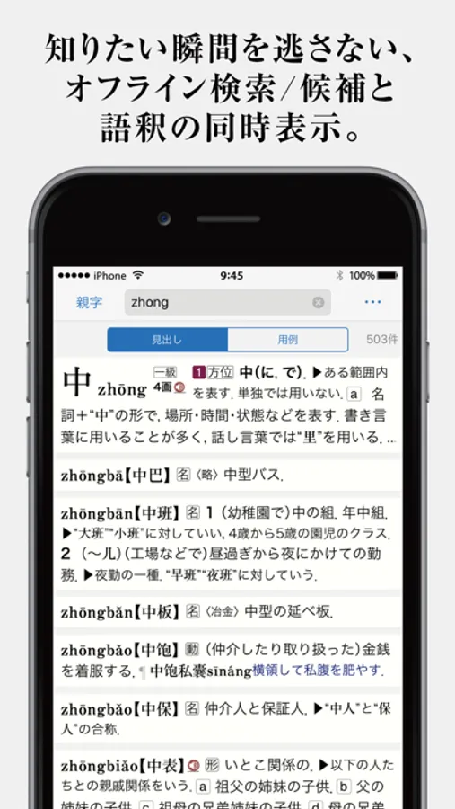 アプリ『中日・日中辞典【第3版】』では、親字優先モードを搭載しました。このモードでは、親字のみの検索を行うことができます。検索された親字を選択すると、その語で始まる熟語のみを表示することができます。