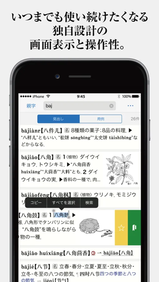 紙の辞典とまったく同じ内容でありながら、iOS端末にインストールされるため携帯性に優れるとともに、価格も三分の一以下と圧倒的なコストパフォーマンスを誇ります。