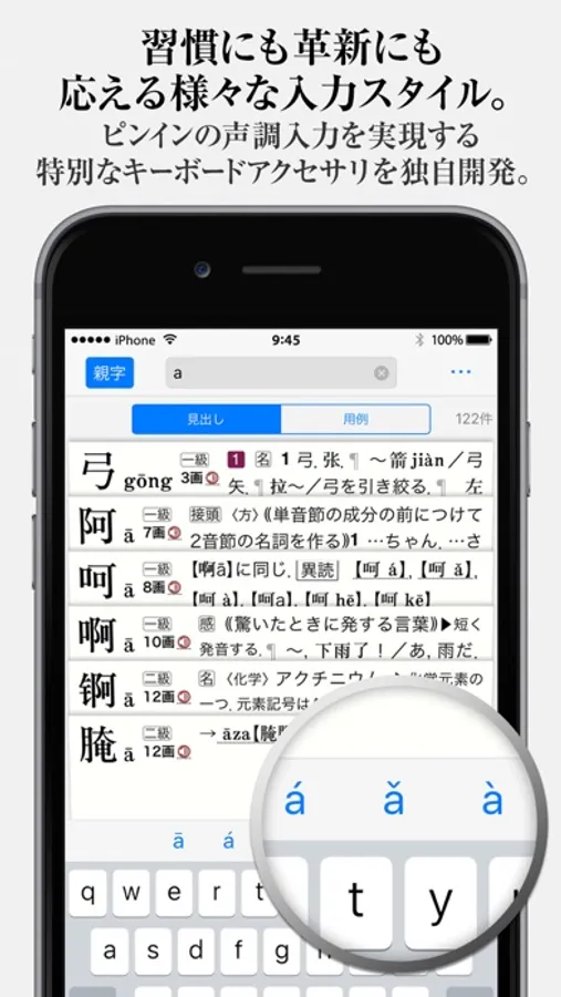 中国語を検索する手段として、ピンイン入力を準備しています。キーボードアクセサリを使って、1声から4声の声調を簡単に入力できます。また、手書き入力はもちろんサポートしています。さらに、本語音訓索引、総画索引、部首索引など多彩な入力方法が用意されていますので、初心者でも簡単に使えます。