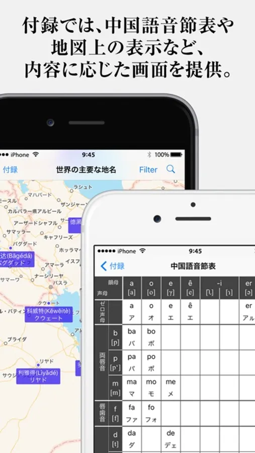 『中日辞典』の収録語数は10万語、新語8,000語を増補。そして『日中辞典』は収録語95,000語、新語5,000語を増補しています。場面別会話表現や、人名・地名・企業名・ブランド名・文書記号の使い方など、役立つ付録も充実しています。ネイティブスピーカーによる音声で、中国語の重要語約1万6000語の正しい発音を確認できます。