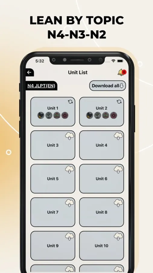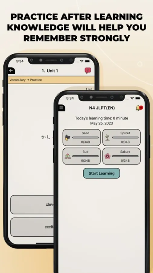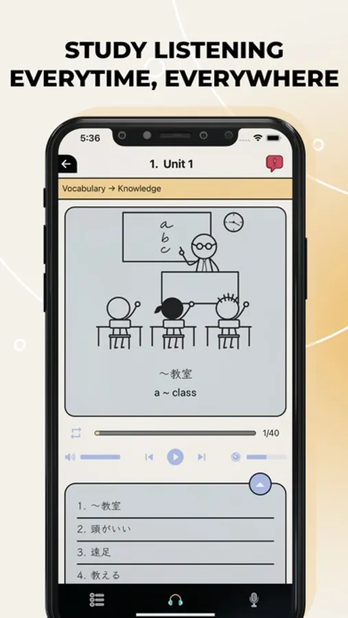 1. Basic knowledge of words and Kanjis: In each unit, you can check the audio, characters and meanings. (N4 words have illustrations)