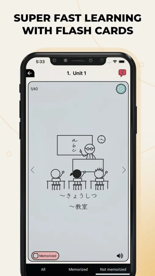 2. Flashcards: With Japanese in front and mother language in the back, you can flip the flashcards to check your knowledge and focus on practicing over and over the ones not memorized yet.