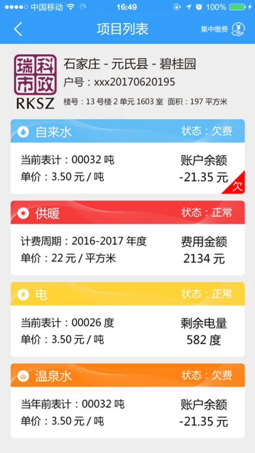 科技,让生活更简单。瑞科市政收费服务系统是一款生活缴费软件。用户通过该软件可以查看家中水表、电表、燃气表、热力表等的数值信息,也可进行相关缴费。立即下载,感受科技带给您的便捷与贴心。