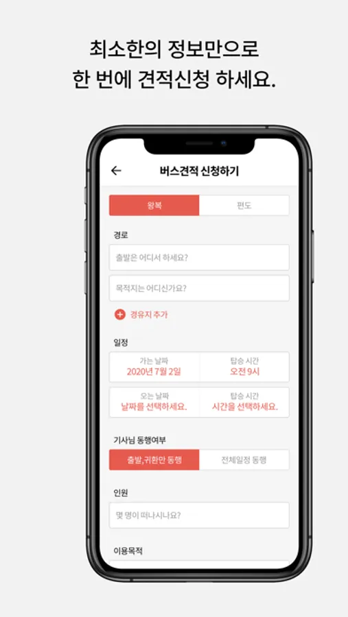- 출발지와 도착지, 인원 등 최소한의 정보만 입력하고 버스견적 받아보세요.