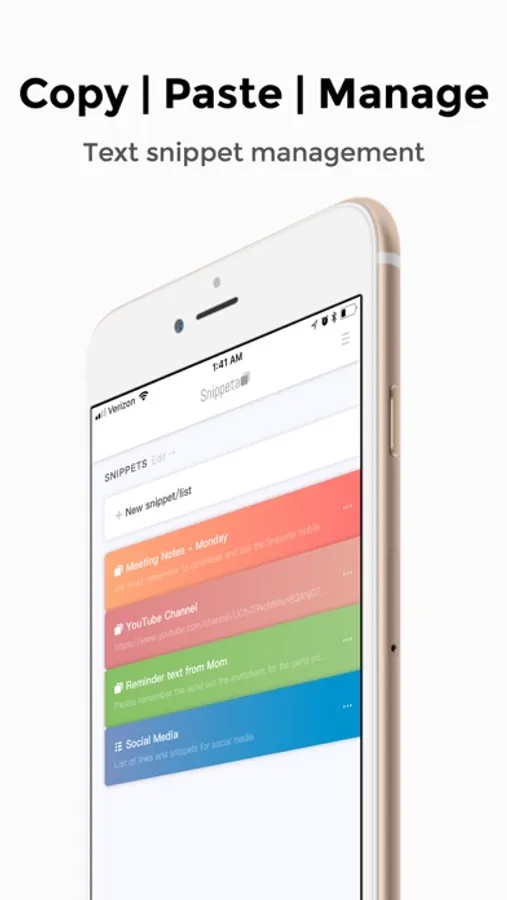 The Snippeta app is the best way to copy, paste, and manage snippets of text! Copy snippet text to your clipboard with a single tap; no highlighting or long-tapping! Snippeta is the clipboard manager to rule them all!