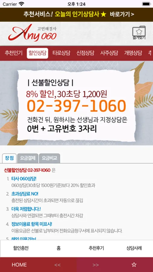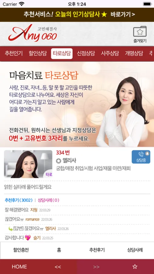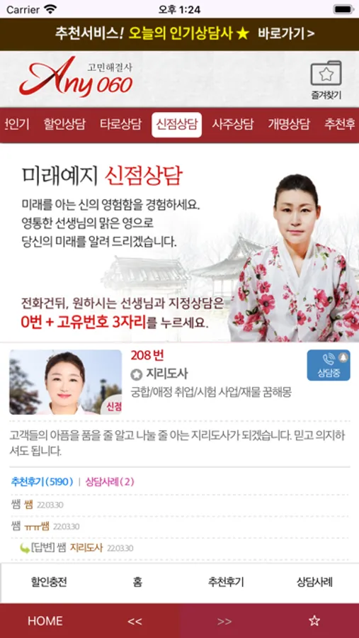 - 앱에서 선생님 상담하기 버튼 클릭 시 ARS에서 선생님 선택 버튼 누름 없이 해당 선생님과 바로 연결되어 운세상담이 가능합니다.