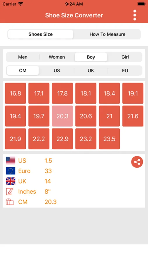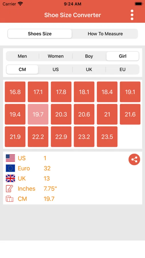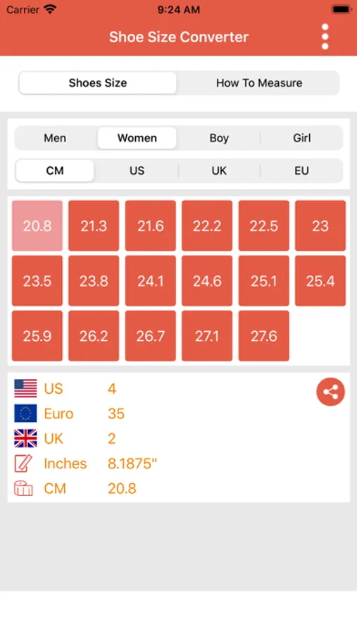 Shoe Size Converter is an app that help you convert a shoe size from UK to US or vice versa. You can find shoe size conversion for men and women in this app. Using this app you will never need to use shoe size conversion chart. It has a very simple UI and an amazing interface to start with.