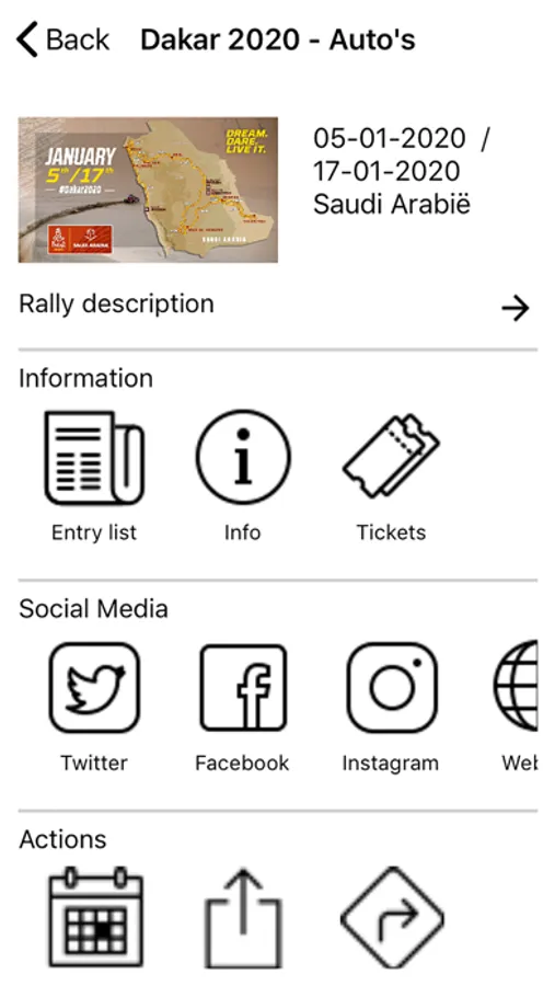 You can add a rally event to your device's calendar with one click. Navigation to an event is also easy with only one click on the navigate button.