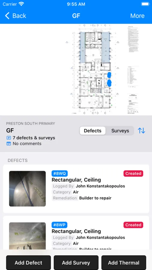 The Energy Leaks Defect Reporter (ELDR) from Efficiency Matrix is a tool to help survey insulation consistency and air tightness testing of buildings. There is also functionality for auditing general defects, or even just a non-defect related survey for maintenance.