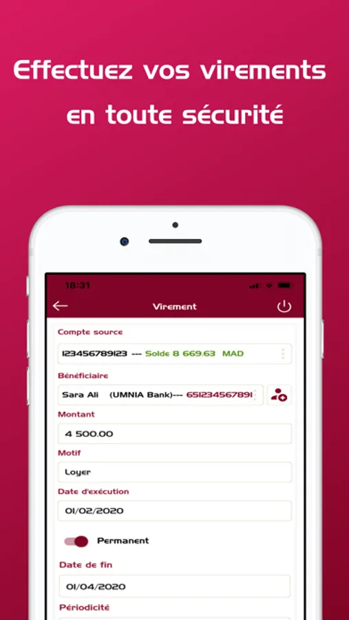 - Effectuer et suivre vos virements vers les comptes Umnia Bank et confrères