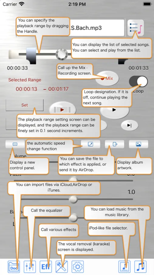 It has various functions such as repeat playback with specified range, speed change / pitch change function, vocal delete function, mix recording function, file export function and so on.