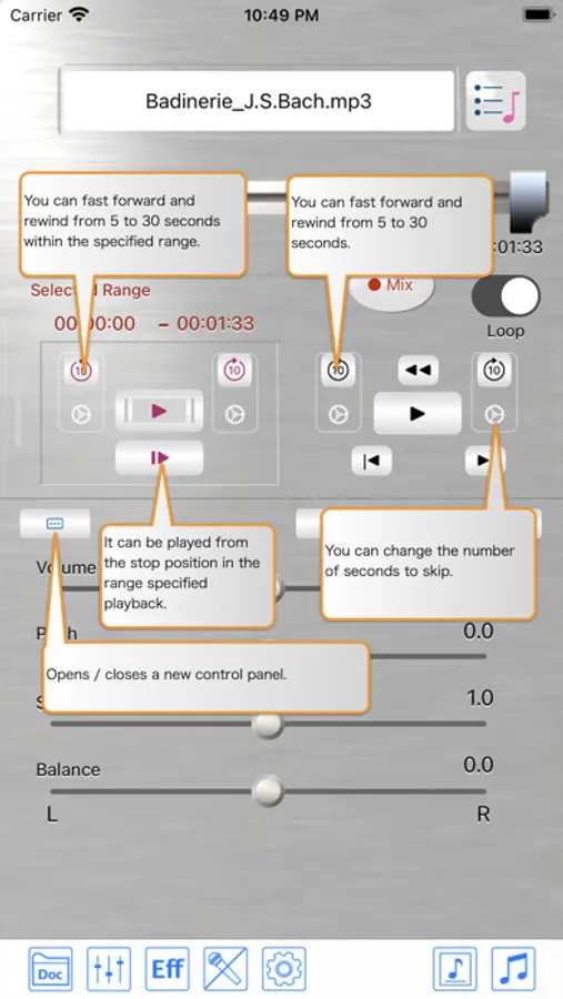 There is also a repeat playback function with a specified range. It is most suitable for musical instrument practice and ear copy etc. with a lowered tempo.