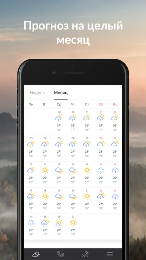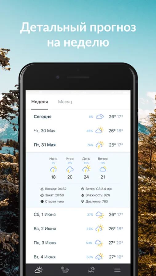 Планируете путешествие или поездку? Не стоит переживать о погоде, в нашем приложении есть возможность посмотреть прогноз на 30 дней вперёд.