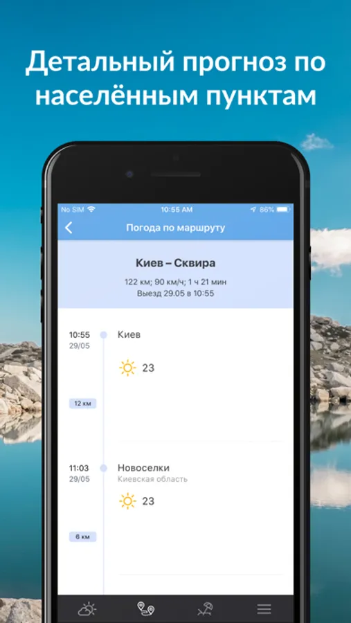 Раздел «Погода по маршруту» заранее позволит спланировать по дорогам Украины свой путь до озер, морей, целебных источников, лыжных трасс или прохладных лесов таким образом, чтобы избежать ливней, гололеда, тумана в дороге – или, по крайней мере, быть готовым к погодным сюрпризам.