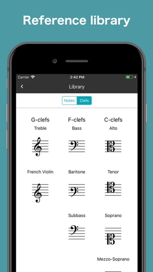 - Practice notes in these clefs: treble, bass, alto, baritone (C or F), french violin, mezzo-soprano, soprano, tenor