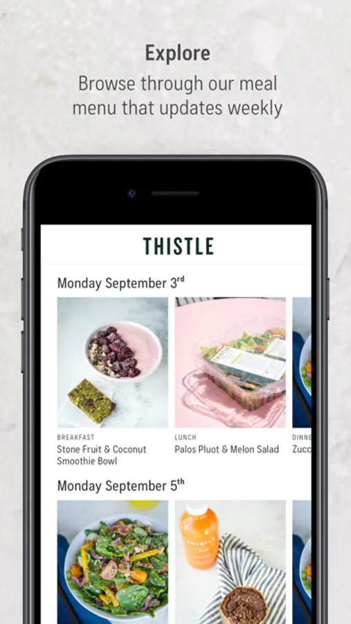 Thistle delivers ready-to-eat, organic meals, snacks, and juices to your door. Say goodbye to grocery store lines, meal prepping your weekends away, and cooking after a long day at work. Say hello to more time for the things you love and a healthier body and mind.
