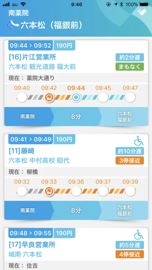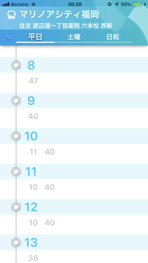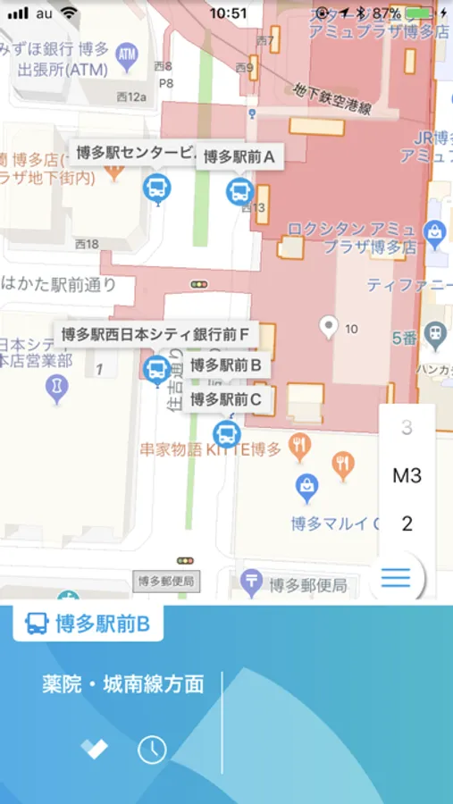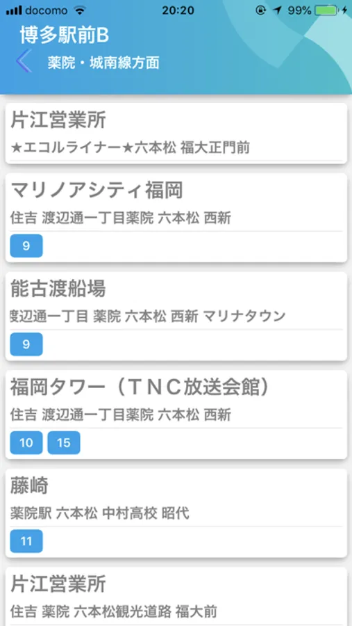 地図のバスアイコンを押すとバス停の行き先方法を選びましたらバス情報が表示されます。