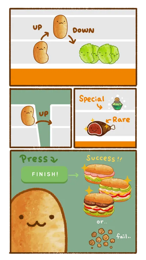 A cute bread character walks around the mart and eats his favorite ingredients and become a sandwich. If you do not have enough ingredients, it may be something other than a sandwich.