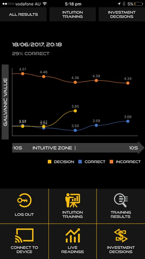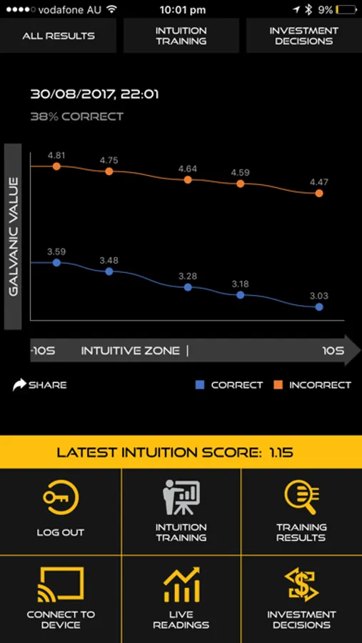 Training Results: The app displays the percentages of correct decisions as well as your intuition score. The intuition score is a reflection of your intuitive strength, which is derived from a measure your anticipatory subconscious body reactions . The more you train the better your intuition score. You can monitor your progress on your phone, PC or Mac and share your progress on social media.