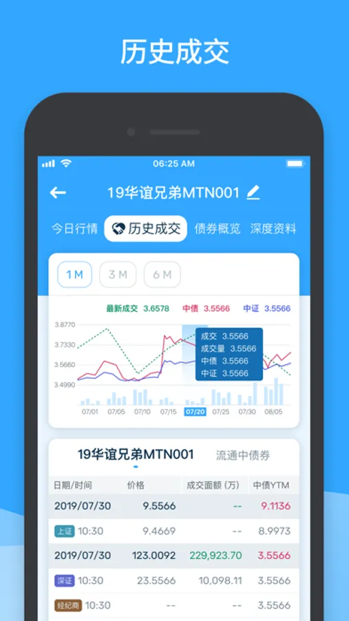 3、成交汇总。汇总主体&个债的成交历史一键搜索,提供最近6个月历史明细