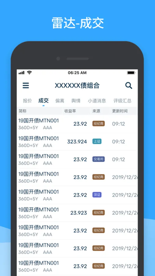 4、债券雷达。针对关注主体和债券实时预警,囊括报价、成交、偏离、舆情、小道消息、评级等