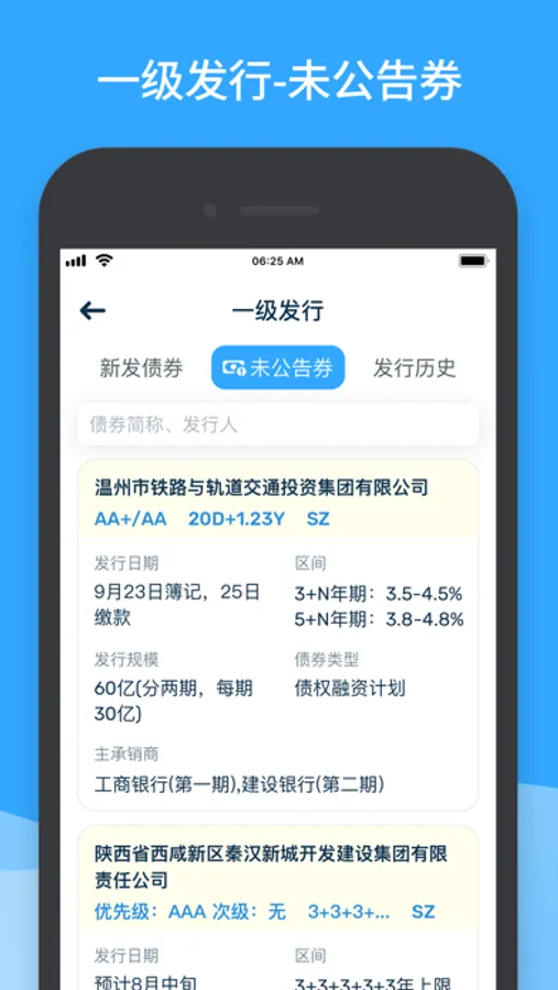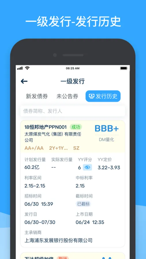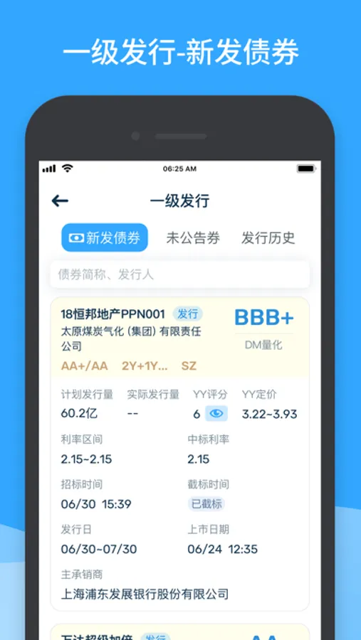 6、一级发行。新增未公告券、新债发行、发行历史,新发债券早知道,价格对比YY定价与DM量化评分