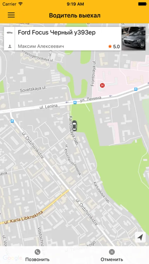 - Приложение показывает подробную информацию о водителе и его автомобиле;