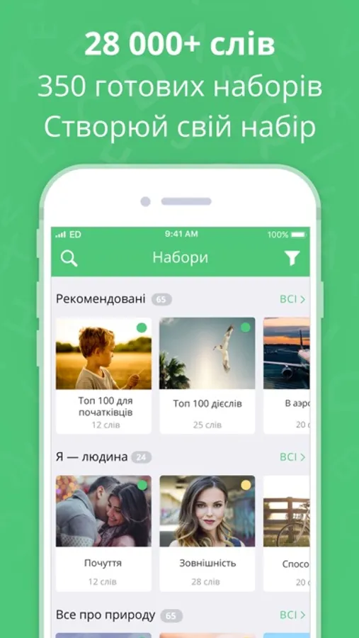 ► більше 28 000 англійських слів для вивчення у 350 тематичних наборах. Вивчай популярні англійські слова по запропонованим темам або створюй свої набори;