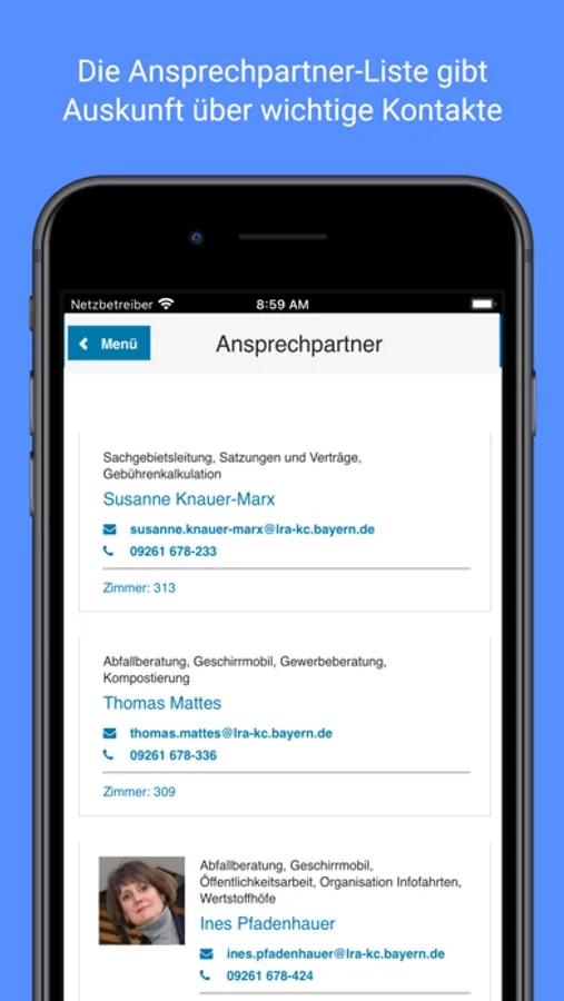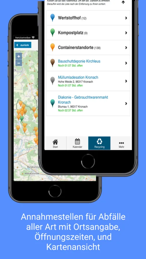 * Annahmestellen für Abfälle aller Art mit Ortsangabe und Öffnungszeiten, inkl. Kartenansicht und Navigation.