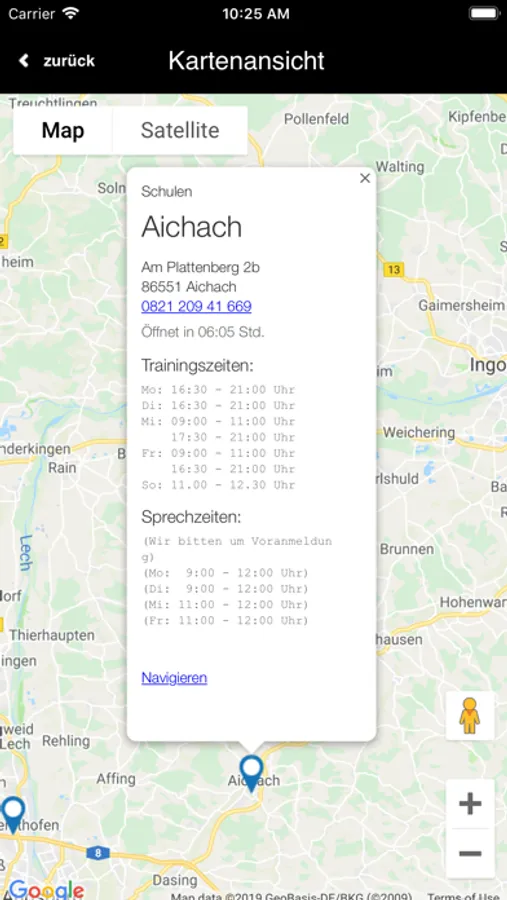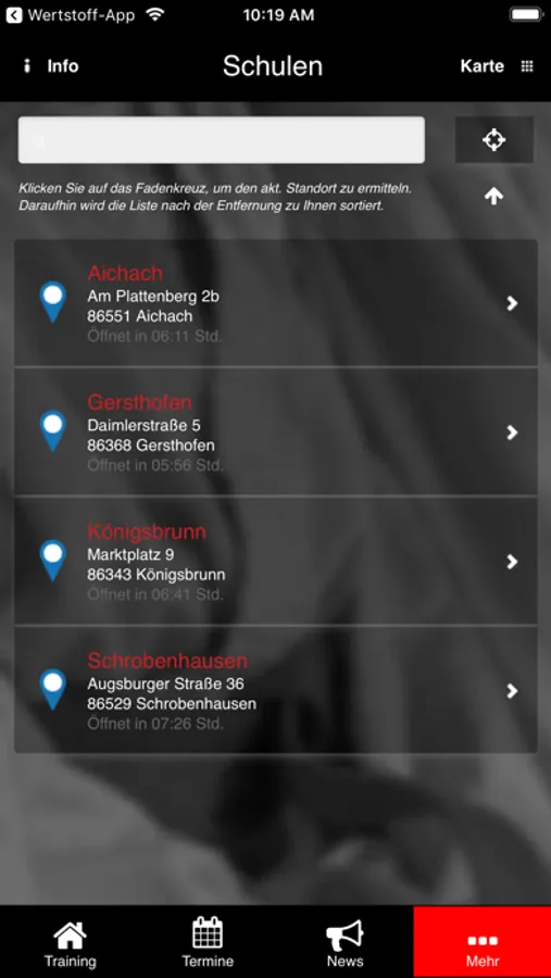 * Alle Schulen mit Ortsangabe, Trainingszeiten und Öffnungszeiten, inkl. Kartenansicht und Navigation.