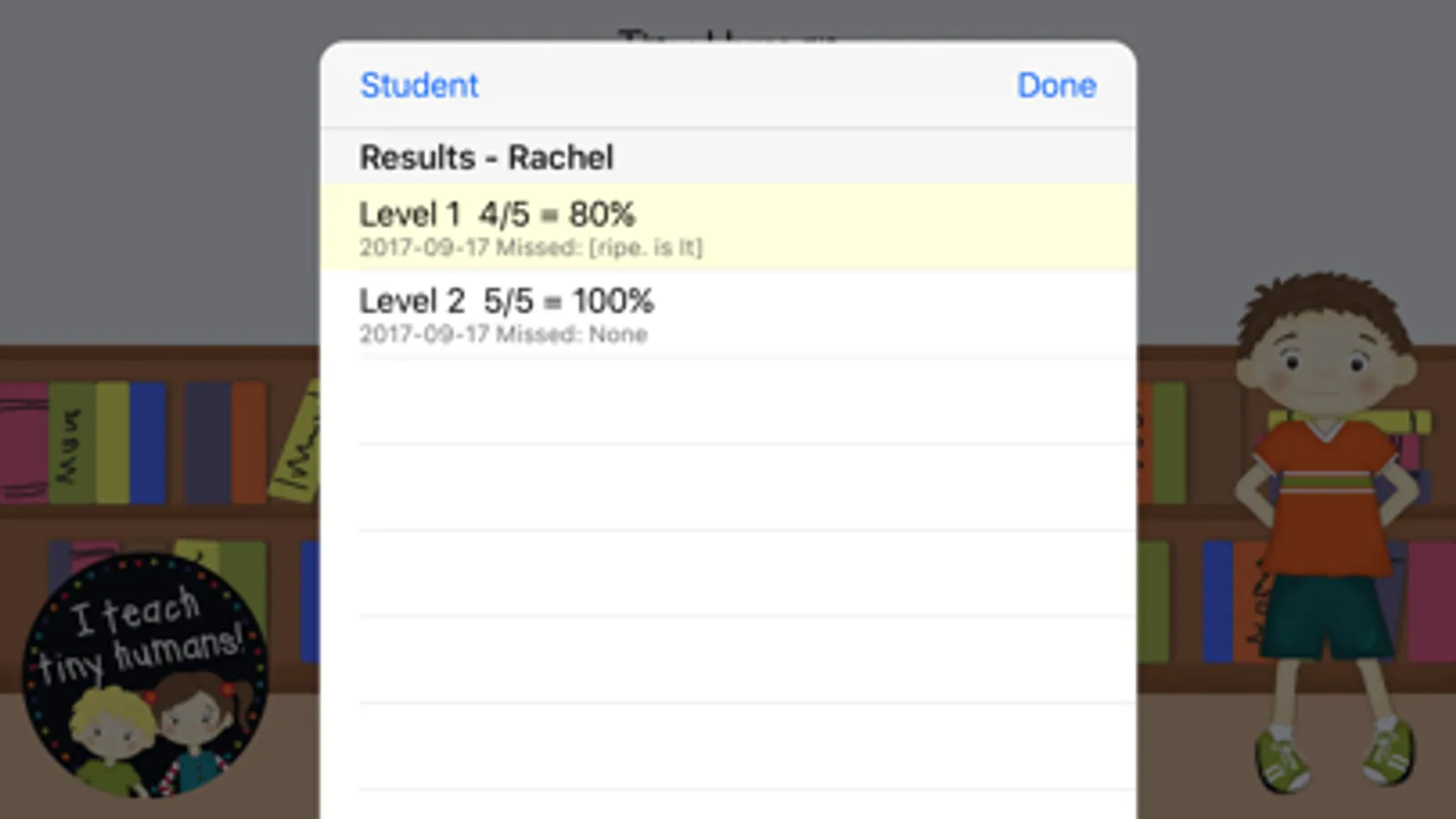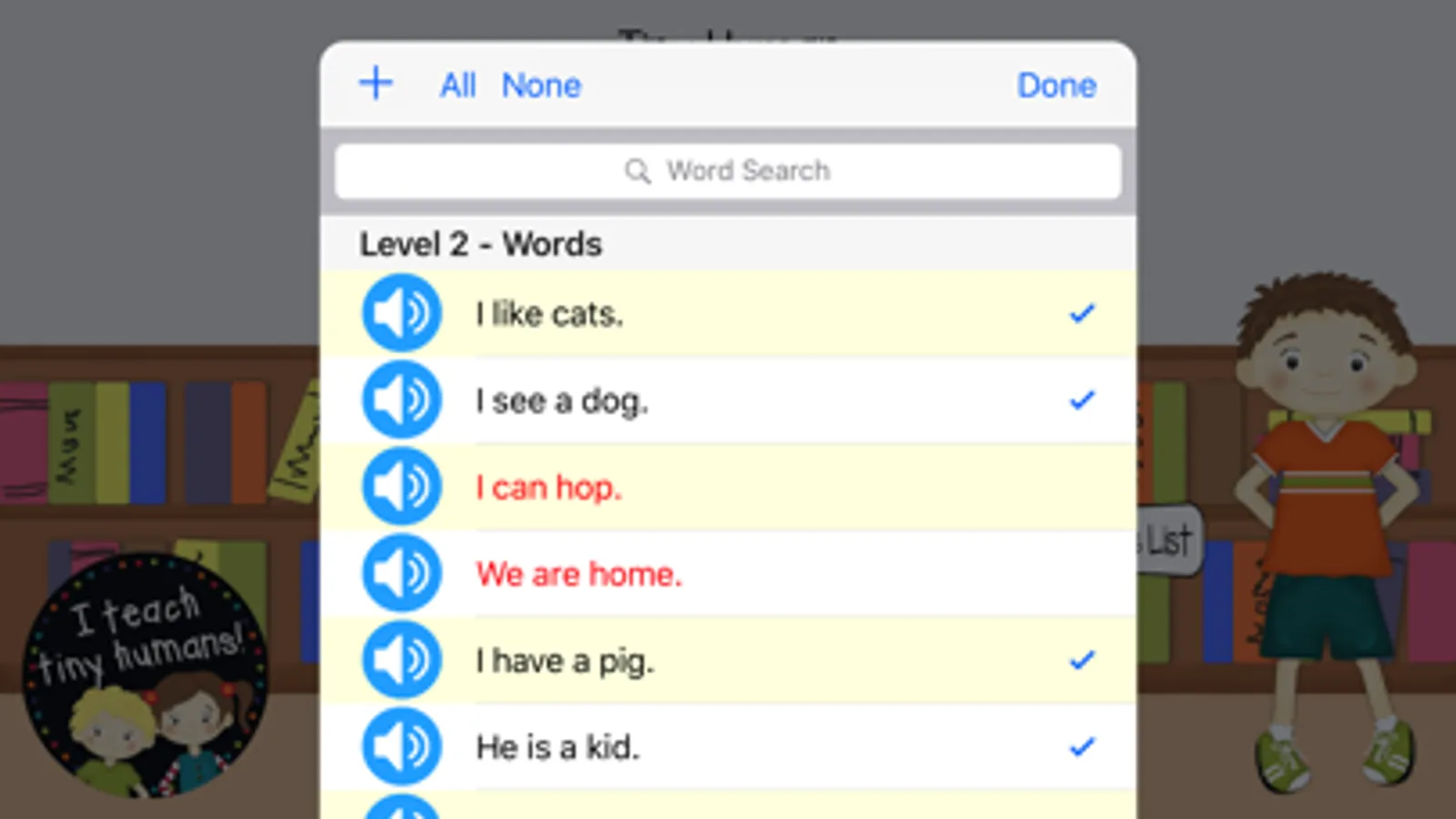 You child or student will have fun reading the words or phrases and constructing them in order to create sentences. The app will check their work and notify them of every phrase that is correct or misplaced. Every interaction is recorded by student and level. This can be reviewed by parents or educators to understand how the child is progressing and areas that need to be focused on for reinforcement or improvement.