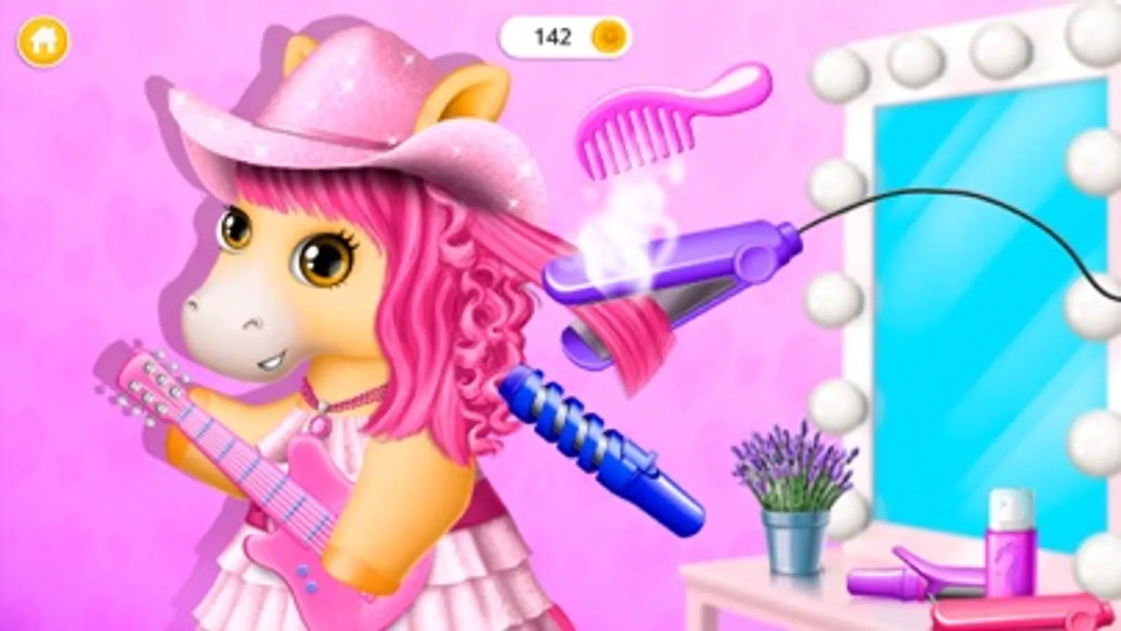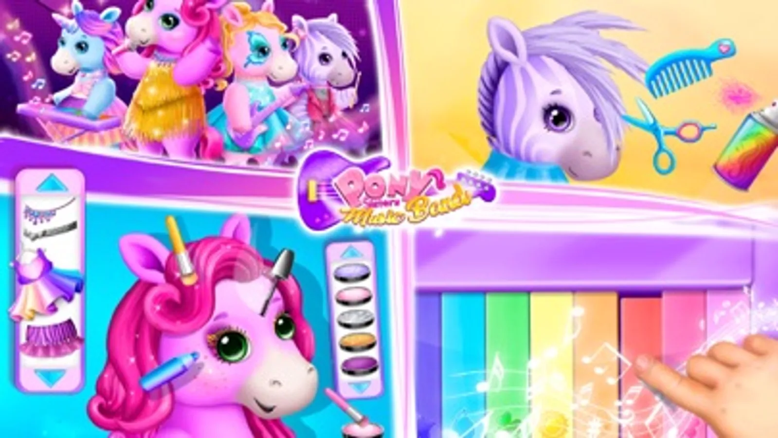 Style hair and design adorable concert outfits for the pony sisters' rainbow pop show on the stage. Do bright rainbow makeup and paint the ponies' faces. Practice drums, play the piano and sing along.