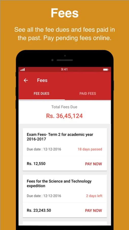 Fees : No more long queues. Now you can pay your school fees instantly on your mobile. All the upcoming fee dues will be listed in the events and you will be reminded with push notifications when the due date is getting closer.