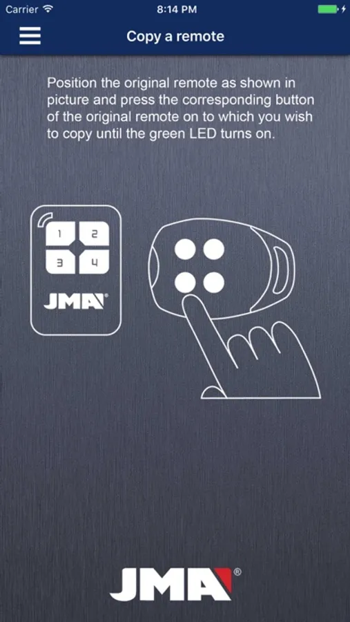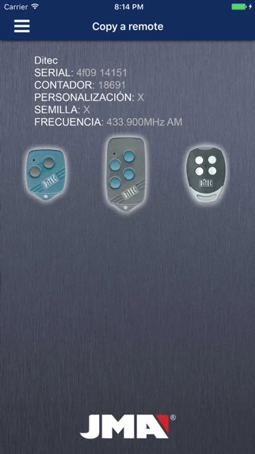 The JMARemotesPro app provides a simple, intuitive and convenient way to copy rolling code and fixed code garage door remote controls. It also offers such additional features as the generation of rolling code remotes without needing the original, the reading of codes already present on a JMA remote and the storage of copied codes in a database.