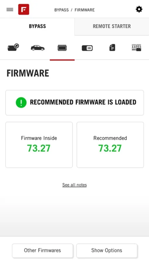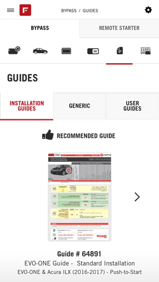 Fortin FlashLink Mobile App is an application that allows the user to connect to the FlashLink Mobile Bluetooth device (sold separately) in order to detect and setup a Fortin remote starter or bypass module. The app allows the user to select a specific vehicle and a firmware version, change options settings, process DCryptor jobs, access installation guides as well as multiple built-in or external technical support tools.