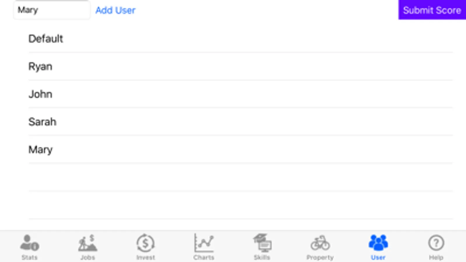 User: You can switch between Users and your games will be saved. You can also use this page to submit your score to Game Center.
