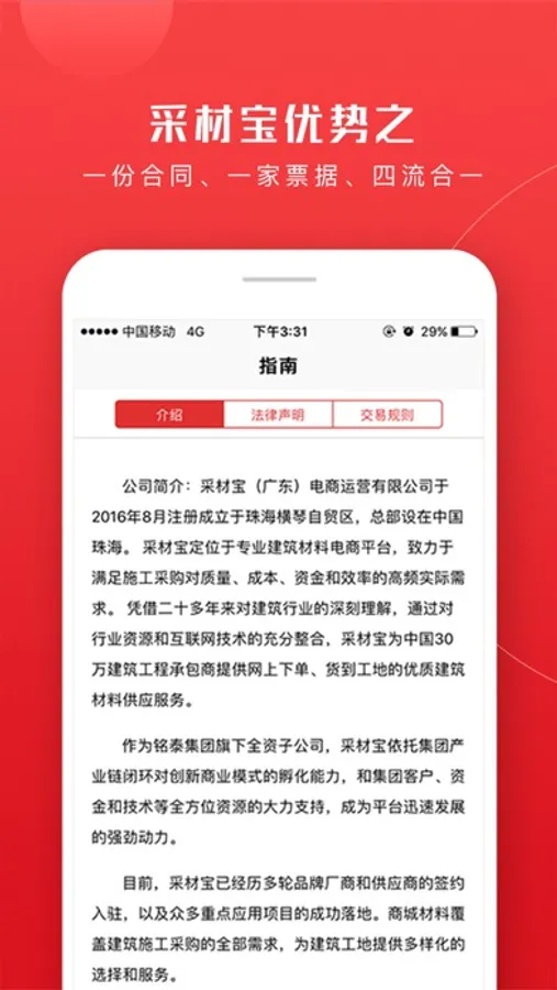 本司定位于专业建筑材料电商平台,致力于满足施工采购对质量、成本、资金和效率的高频实际需求。凭借二十多年来对建筑行业的深刻理解,通过对行业资源和互联网技术的充分整合,本司为中国30万建筑工程承包商提供网上下单、货到工地的优质建筑材料供应服务。