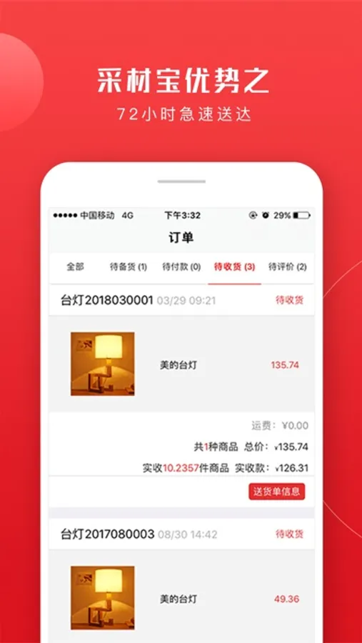 【时效】当天下单、次日到货,大宗材料下单72小 时内保障货到工地;