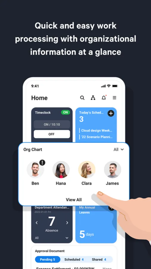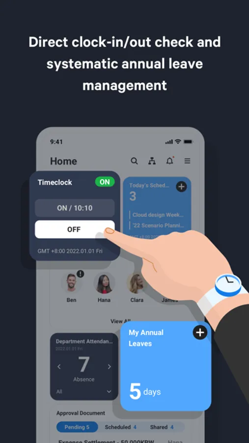 - You can receive notifications about approvals and task processing through Message, and create absence schedules and share them on Calendar.