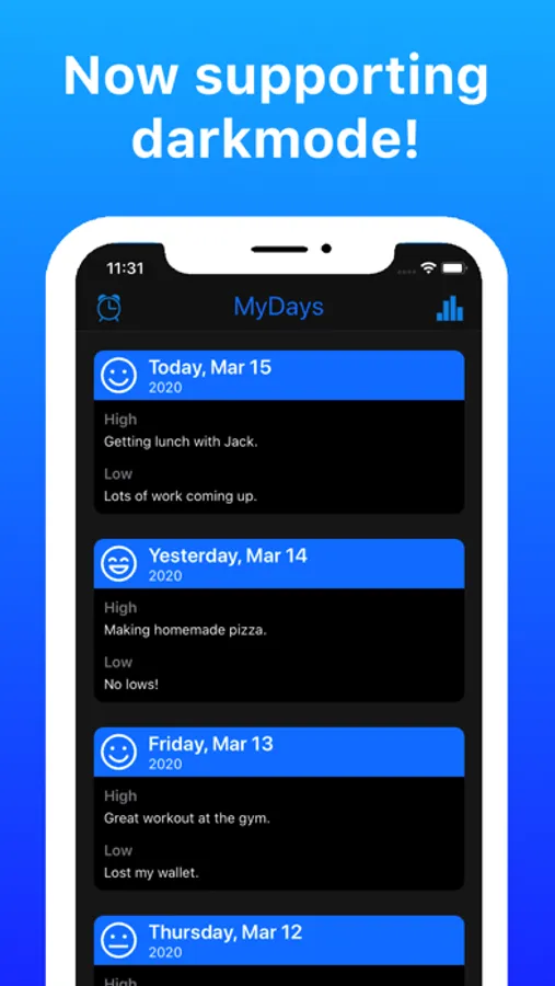 MyDays is a journaling app for the busy individual. Only focus on the important stuff, quickly and easily enter the high and low of each day.