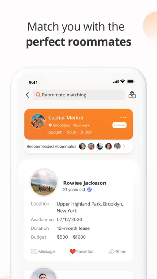 • Match ideal roommates based on your budget, living preferences, and personal interests.