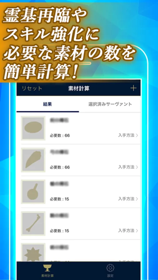 サーヴァントの育成度を入力すれば、必要な残り素材も自動計算されます。