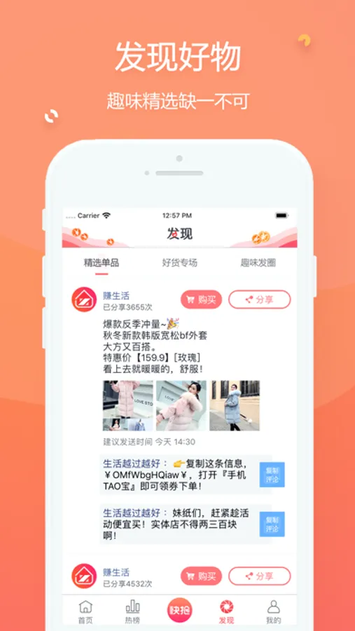 以朋友圈形式展现,帮你发现每日好物,由精选单品,好货专场和趣味发圈组成,方便一键与好友分享!