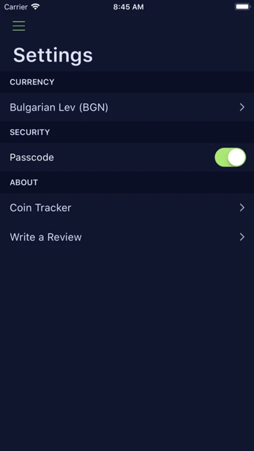 - Selecting a primary currency from Crypto Settings helps currency conversion much easier, app supports all major currencies including USD, CAD, EUR, GBP, AUD, CNY, JPY, SGD, and many more.
