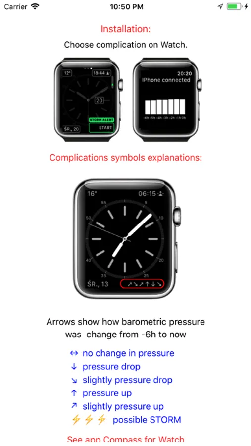This app works best with with Apple Watch Series 3 (use build in barometric sensor) Watch Series 0, 1 or 2 do not has bulid in barometric sensor so this app requires iPhone (6 or later). Reading of barometric pressure is make every 1 hour.