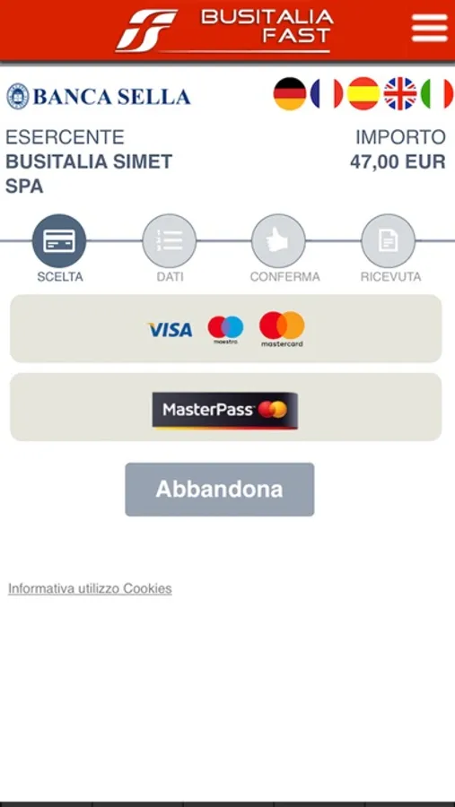 - acquista il biglietto e paga con transazione sicura (Visa, Master card);