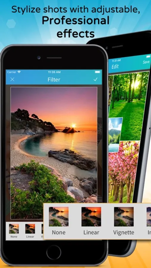 Linear, Vignette, instant, process, transfer, sepia, chrome, fade, curve, tonal, noir, mono, invert.