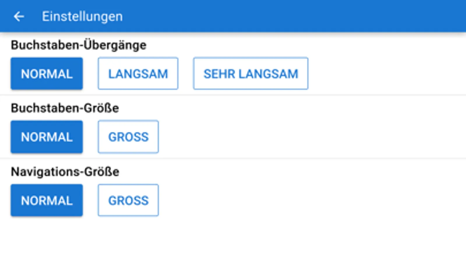 - NEU: Durch individuelle Einstellmöglichkeiten der Größe von Buchstaben oder Navigationsfeldern sowie der Geschwindigkeit der Seitenübergänge kann die App an die Bedürfnisse von Kindern mit motorischen und/oder sensorischen Einschränkungen angepasst werden.