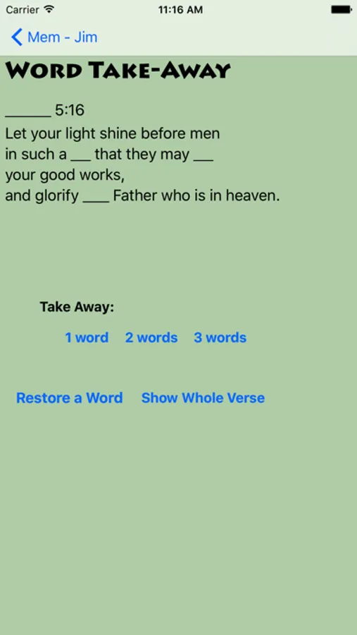 - Memory games such as Phrases (show a phrase at a time), Word Take-Away, and Reference ID (gives the Scripture text and lets you choose the reference)