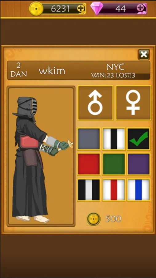 You can design your own game character, purchase new equipment, and compete in a dojo or tournament setting. You can also change the language from Japanese to Korean or turn the sound off.